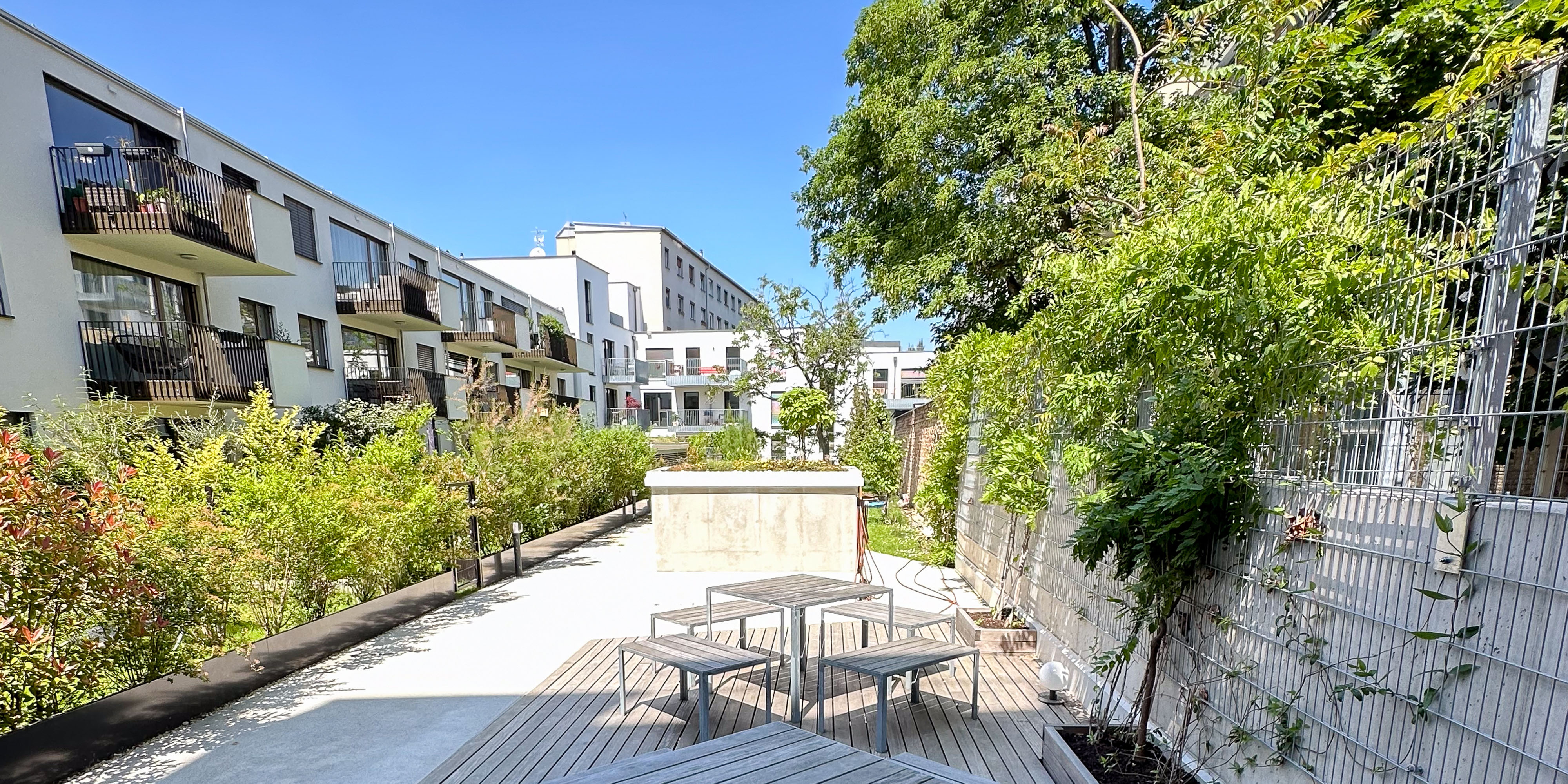 Im grünen Innenhof gibt es eine gemütliche Sitzmöglichkeit für eine entspannte Pause und einen kleinen Kinderspielplatz, damit auch unsere kleinsten Gäste Spaß haben.